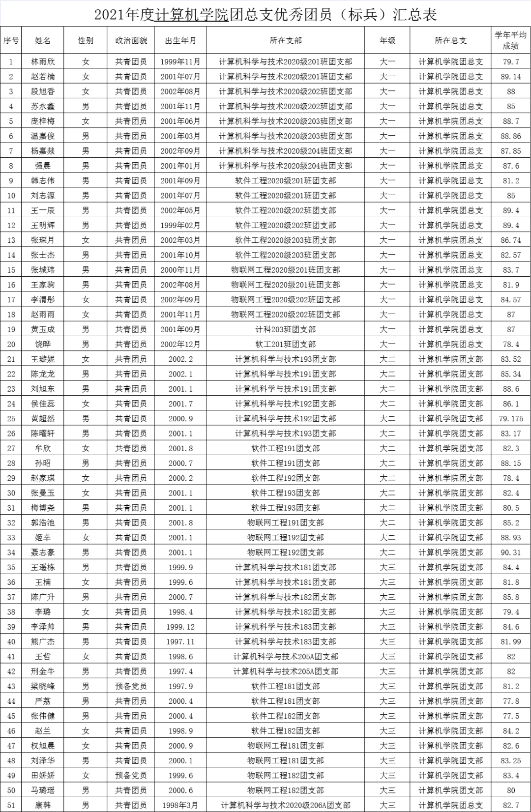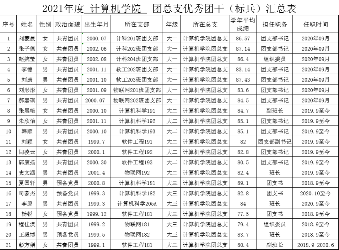 按照校团委《关于开展2021年度MILE米乐集团共青团先进集体和优秀个人的评比表彰》文件要求,计算机学院团总支已全部完成评比工作。各班级团支部依据支部投票结果评预推荐对象,学院团总支结合团支部青年大学习、主题团日活动、团员团干日常考核、团支部建设等情况,全面并根据上一学年考试成绩进行最终评定,确定最终推荐对象。现将拟订优秀团员(标兵)、优秀团干(标兵)、优秀团支部和星级志愿者名单进行公示。