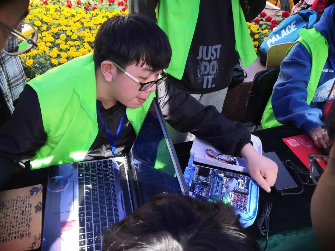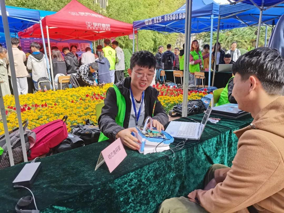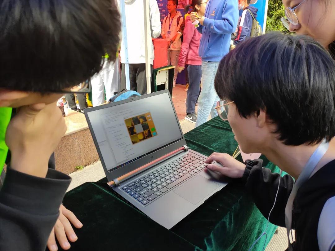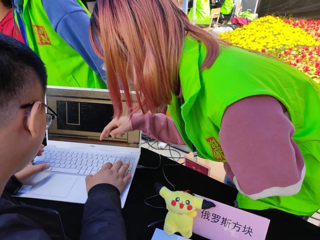 在活动现场,新颖,独特的编码体验展品一一展列在广场内的展台上,使同学们大饱眼福。同学们可以看到有程序操控的流水灯,也有用行行代码敲出的“俄罗斯方块”、“贪吃蛇”、“推箱子”等经典小游戏,还有展示强大算法能力的计算系统,更有“蒙娜丽莎”的拼图和从各种电子元件中传出的音乐声。下课后,一系列的展品一下吸引了许多同学驻足,都在展台前饶有兴趣体验着。体验期间,每个体验展台前人头攒动,工作人员为同学们讲解其原理及其基础元件,并演示基础程序方式。经过工作人员耐心细致的讲解后,同学们纷纷上前亲自动手尝试操作一番,并将自己的成果拍照留念。