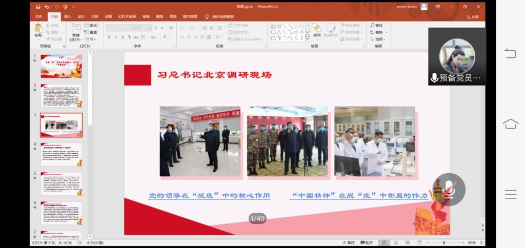通过本次讨论课大家更加深刻认识到,作为学生党员,应该不忘初心,牢记使命,坚定党的领导。战疫过程是彰显中国精神力量的过程,生动诠释了中国精神的时代内涵和磅礴力量。