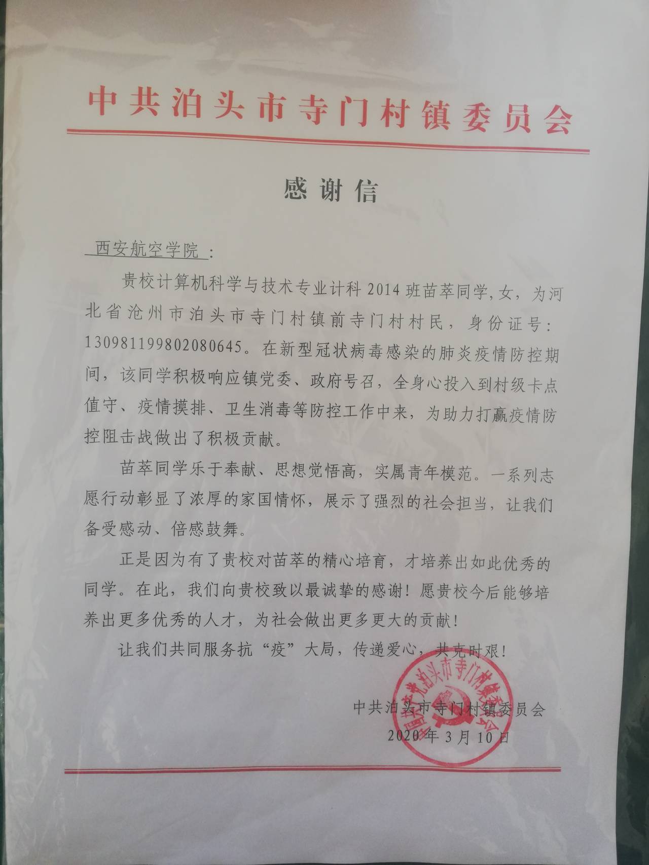 近日,MILE米乐集团收到一封来自河北省泊头市的感谢信,信中对学院计算机科学与技术2014班学生苗萃在疫情期间乐于奉献的精神和作为志愿者的优异表现进行肯定和赞扬,并对学院培养出如此勇于担当的学子表示感谢。