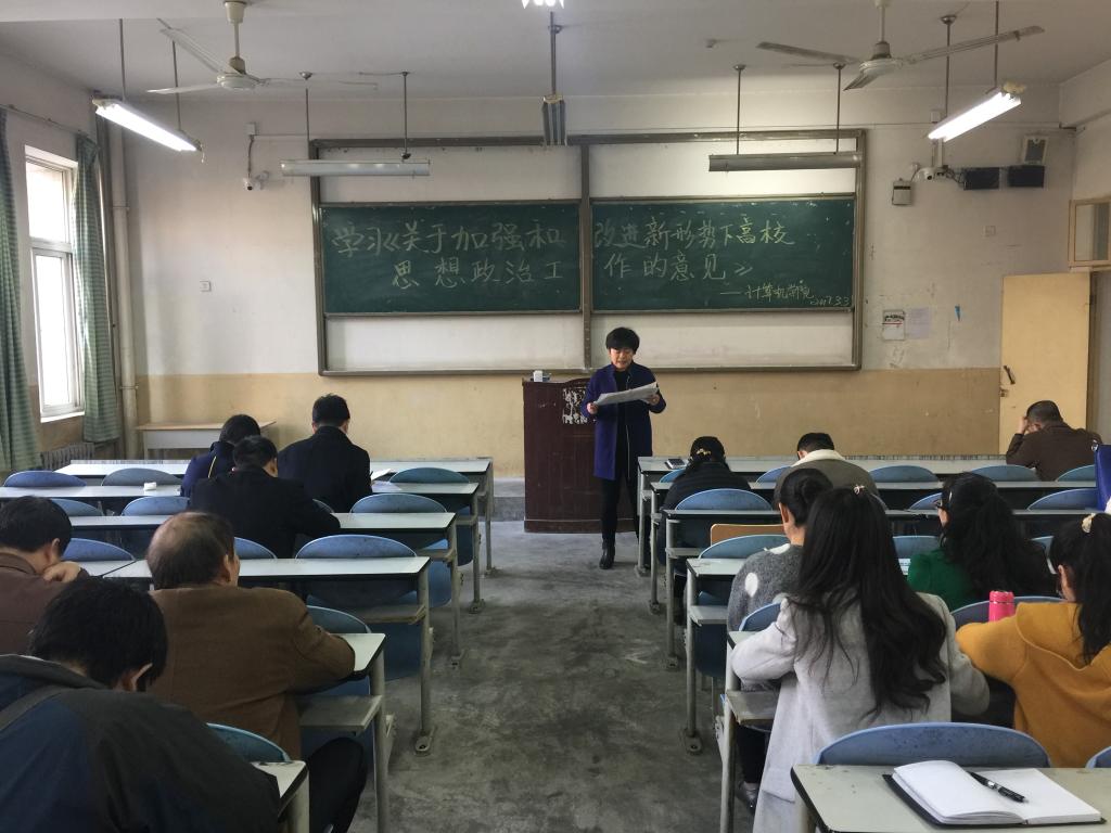 《意见》有七个部分:重要意义和总体要求;强化思想理论教育和价值引领;发挥哲学社会科学育人功能;加强对课堂教学和各类思想文化阵地的建设管理;加强教师队伍和专门力量建设;推进高校思想政治工作改革创新;加强和改善党对高校的领导。随后,刘晋云书记带领大家学习了《中央宣传部、中央组织部、教育部负责人就< 意见>答记者问》。通过学习,大家进一步明确了为什么要制定加强和改进高校思想政治工作的《意见》;加强和改进高校思想政治工作总体上把握的要求;在加强教师队伍、思想政治工作和党务工作队伍建设方面有哪些具体措施等。刘书记希望大家在努力教书育人的同时,要关心国内外大事,不断提升自身的理论素养,努力做“有理想信念、有道德情操、有扎实学识、有仁爱之心”的好老师。