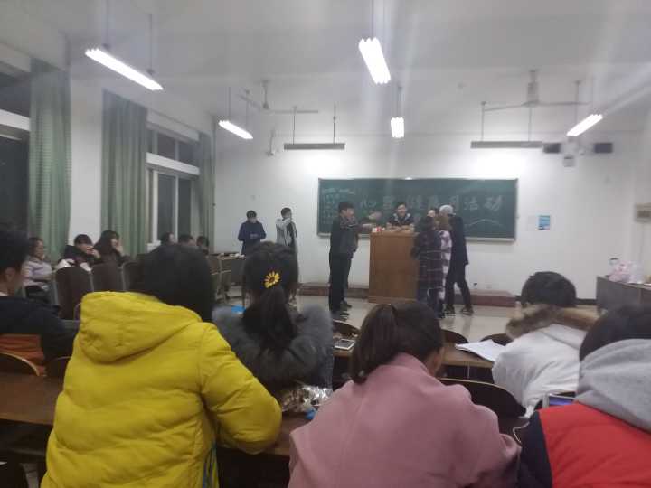 活动开始,各班主持人为大家详细介绍了大学生的心理健康问题及危害,分析了大一新生产生心理问题的原因,同时对今后大学生在面对心理健康问题时处理的方法也进行了说明。接下来是精彩的游戏环节:各班主持人以"击鼓传花"的方式来选出参加游戏的人选,在这个环节上,各班同学充分展示了手速与技巧的结合,水瓶在同学们手里传递,被选出的同学参加了"各位英雄请抱拳"、"记忆考验"游戏,游戏输的人要吃蘸上辣椒酱的面包,观众席中笑声不断。整个活动过程中,所有同学积极参与,畅所欲言,感受着集体的温暖。