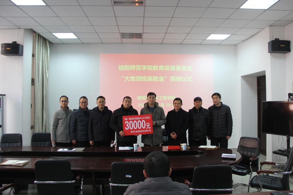 12月28日,信阳师范学院“大地测绘奖教金”捐赠仪式在我校玩滚球的十大正规平台206会议室举行。信阳大地测绘信息有限公司总经理汪波,校对外联络处办公室副主任齐东伟,玩滚球的十大正规平台领导班子和全体教工参加仪式。仪式由玩滚球的十大正规平台党委书记方明科主持。